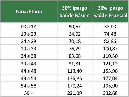 O Ipasgo Saúde opera com dois modelos de custeio: Atuarial, em que a mensalidade varia por faixa etária e todos os dependentes contribuem; e Percentual, que aplica percentual fixo sobre o salário, independentemente do número de dependentes.