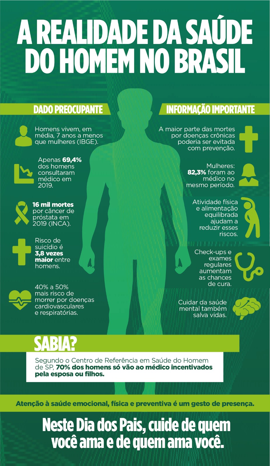 No mês dedicado aos pais, o Ipasgo Saúde reforça a importância da prevenção e dos cuidados com a saúde masculina. Segundo o Instituto Brasileiro de Geografia e Estatística (IBGE), homens vivem, em média, sete anos a menos que as mulheres, e isso está diretamente relacionado à ausência de hábitos saudáveis. As doenças crônicas não transmissíveis (DCNT), que afetam o sistema cardiovascular, respiratório e incluem diversos tipos de câncer, estão entre as principais causas de mortalidade masculina.